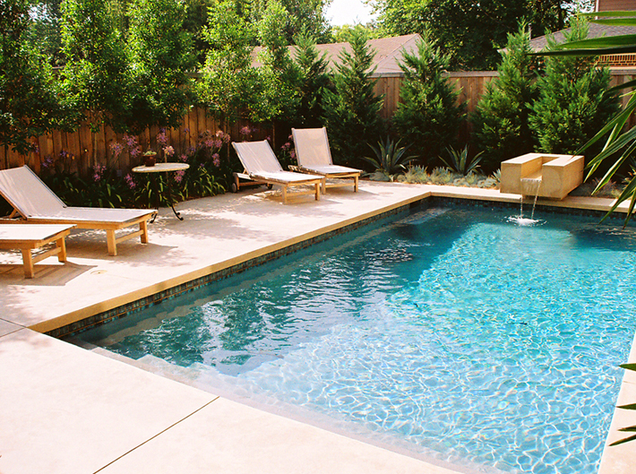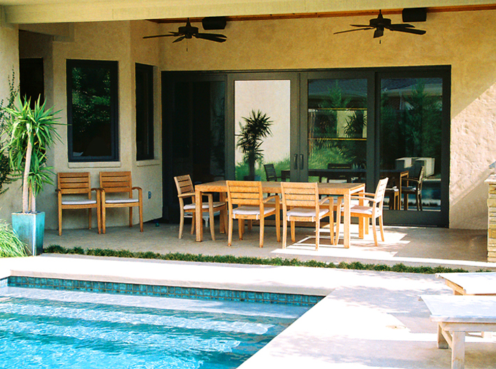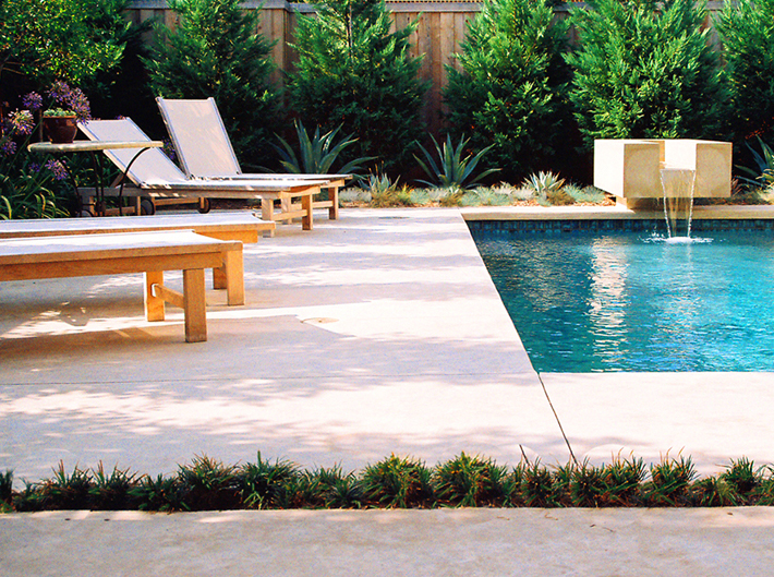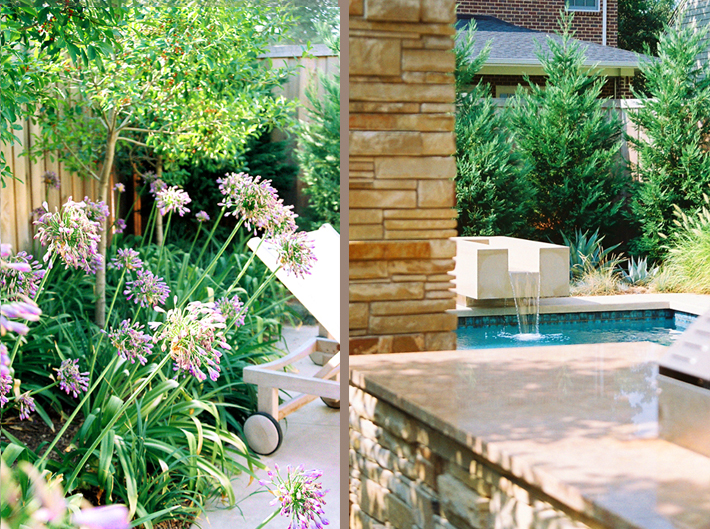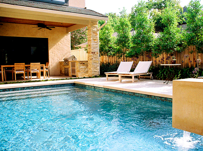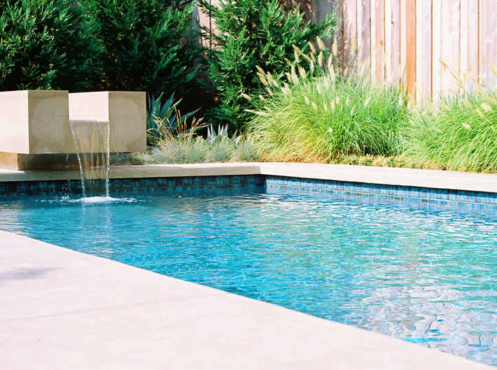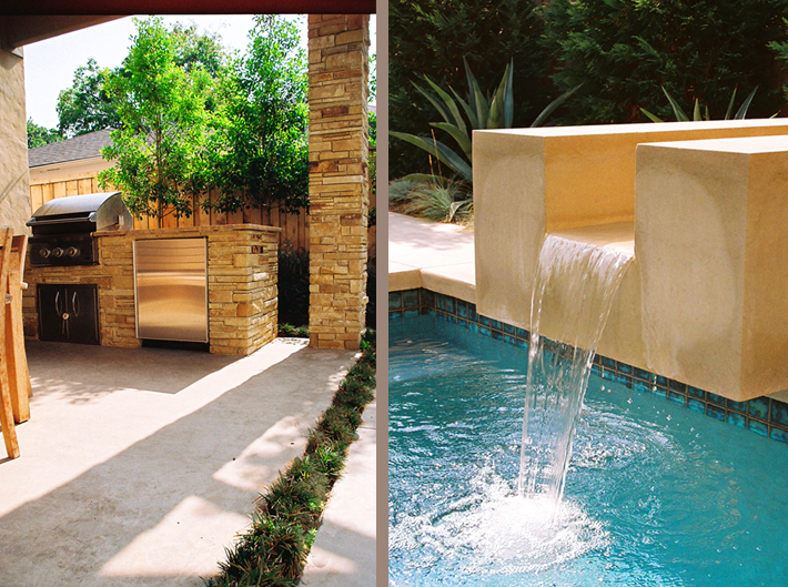 and dining terrace, which extend directly from interior living space. A cut stone runnel anchors the swimming pool, animating the exterior environment with soothing sound and moving water.