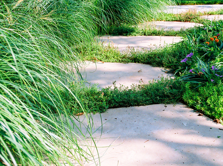 the pool courtyard responds to contemporary architectural features of the house. Visitors are led through mass plantings of grasses and perennials to arrive at the house. The landscape further responds