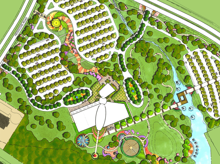 team to develop a circus-themed environment for new children’s hospital. The site plan is organized into zones of use and circulation, designed to break down the scale of a large site and present a friendly, inviting atmosphere to patients and families. Open space amenities include interactive water feature, maze, “circus walk” and connective trail system. Project pursuit – design unrealized.