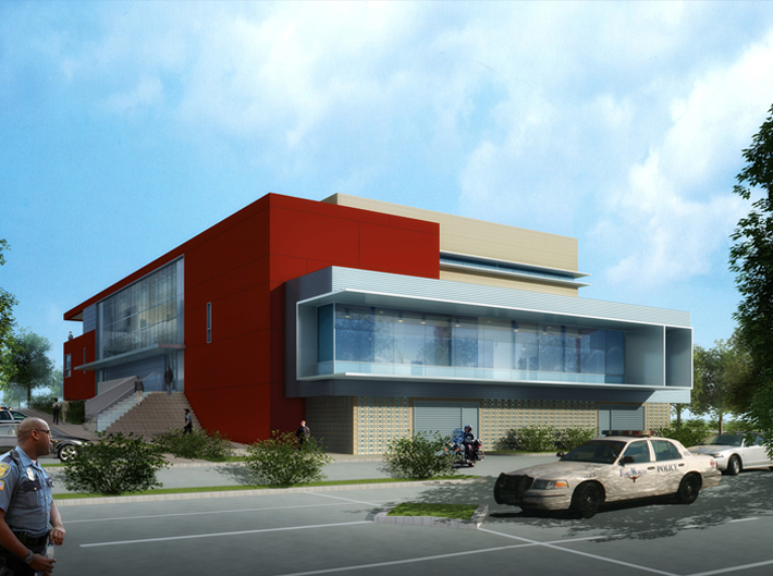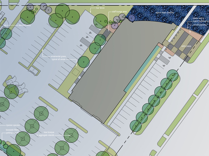 DESIGN :: Bold materials and minimalist landscape design invoke the strength and image of the Fort Worth Police Department. Mass plantings of yucca, geometric paving and planting patterns, and formal tree arrangements compliment the modern architectural design. Permeable paving, bio-swales, alternative turf and native plant palette contribute to the sustainability of this project.