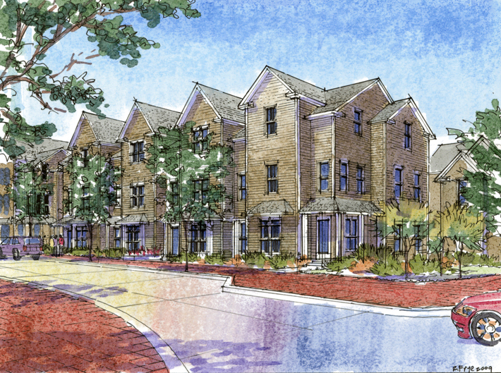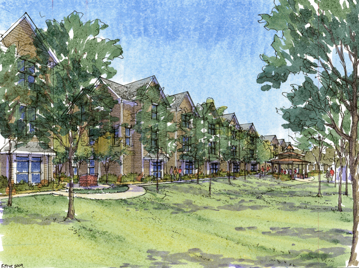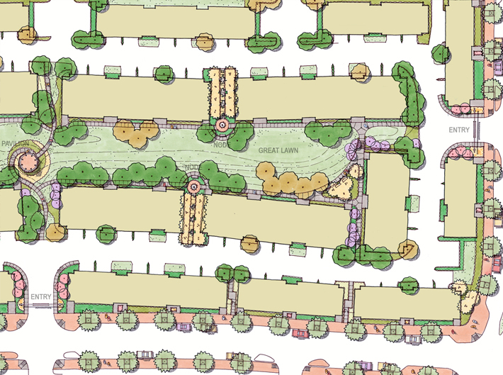 DESIGN :: Transit-oriented residential development in historical downtown environment. Public and private spaces within the project are defined by the landscape: the public side is addressed with a tree-lined urban streetscape, while private space is oriented around a central park for residents. Amenities include event lawn, pavilion, walking trails and monuments to the history of the property.