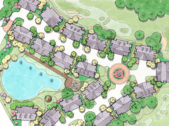 Design developed a low-impact landscape design that takes advantage of native topography, hardwood forest, and borrowed views from Fazio-designed golf course. Open space permeates the community, concentrating