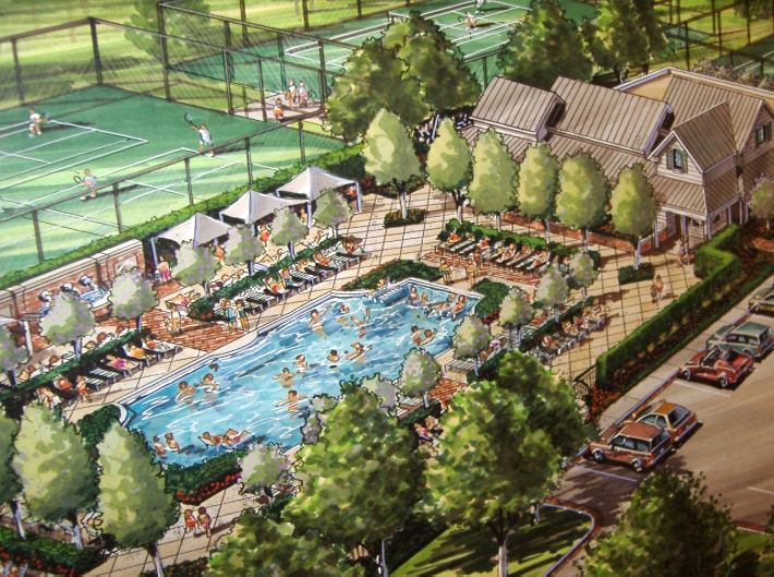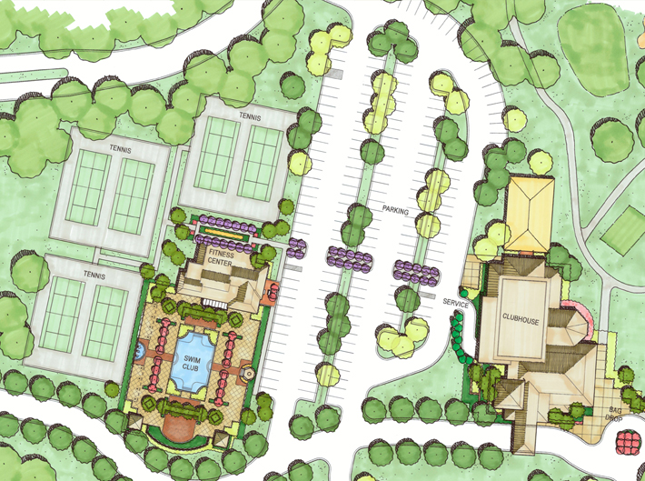DESIGN :: Surrounded by rolling hills and old-growth forest, the landscape design for this country club in northern Mississippi combines modern comforts with old-south architectural traditions. Amenities include lap and kid pools, architectural fountains, sports courts and outdoor dining and lounge. A warm materials palette and lush planting create a sense of luxury and a place for social gathering.